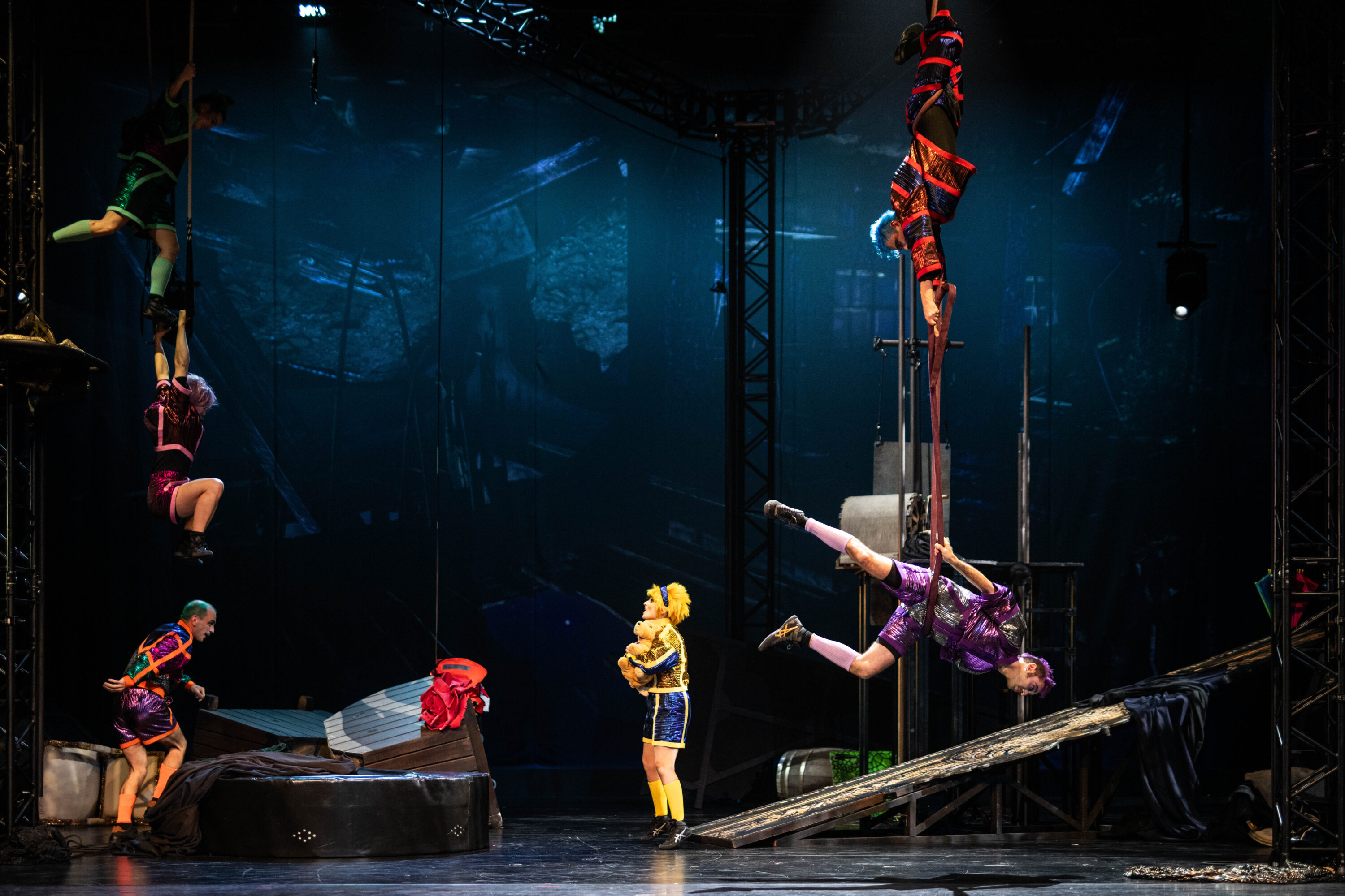 In the performance, we witness two gods locked in an age-old feud. In an apocalyptic landscape, they battle each other with unrelenting fire. Their struggle seems endless — until a travelling circus troupe unexpectedly stumbles upon them. From that moment on, everything changes. Open-hearted, playful, and full of trust, the young circus performers set the world in motion once more. Colour returns, love blossoms, and a happy ending is within reach.